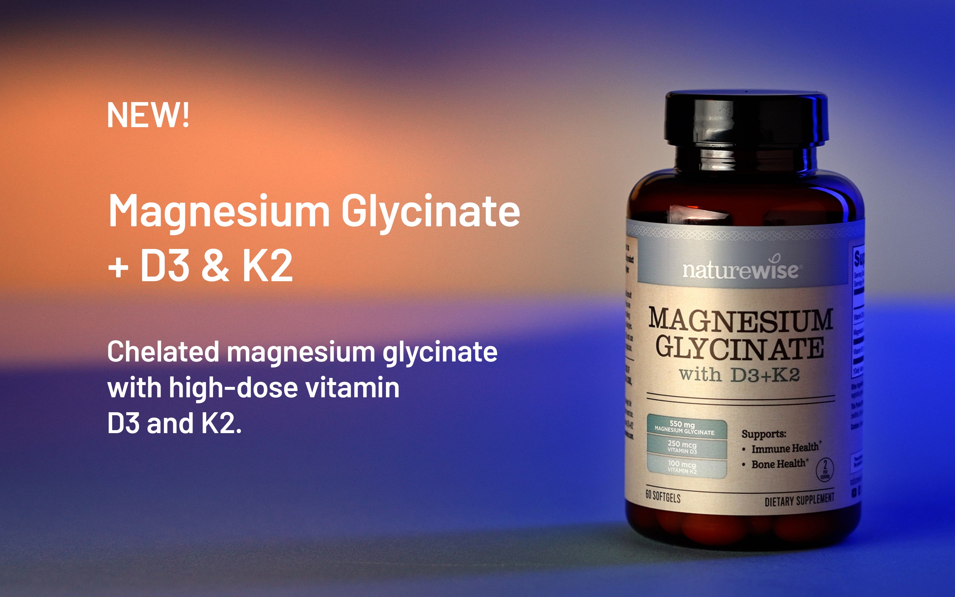 NatureWise Magnesium Glycinate with D3+K2 supplement bottle on a white backgroundTwo beige magnesium glycinate softgels objects on a white background